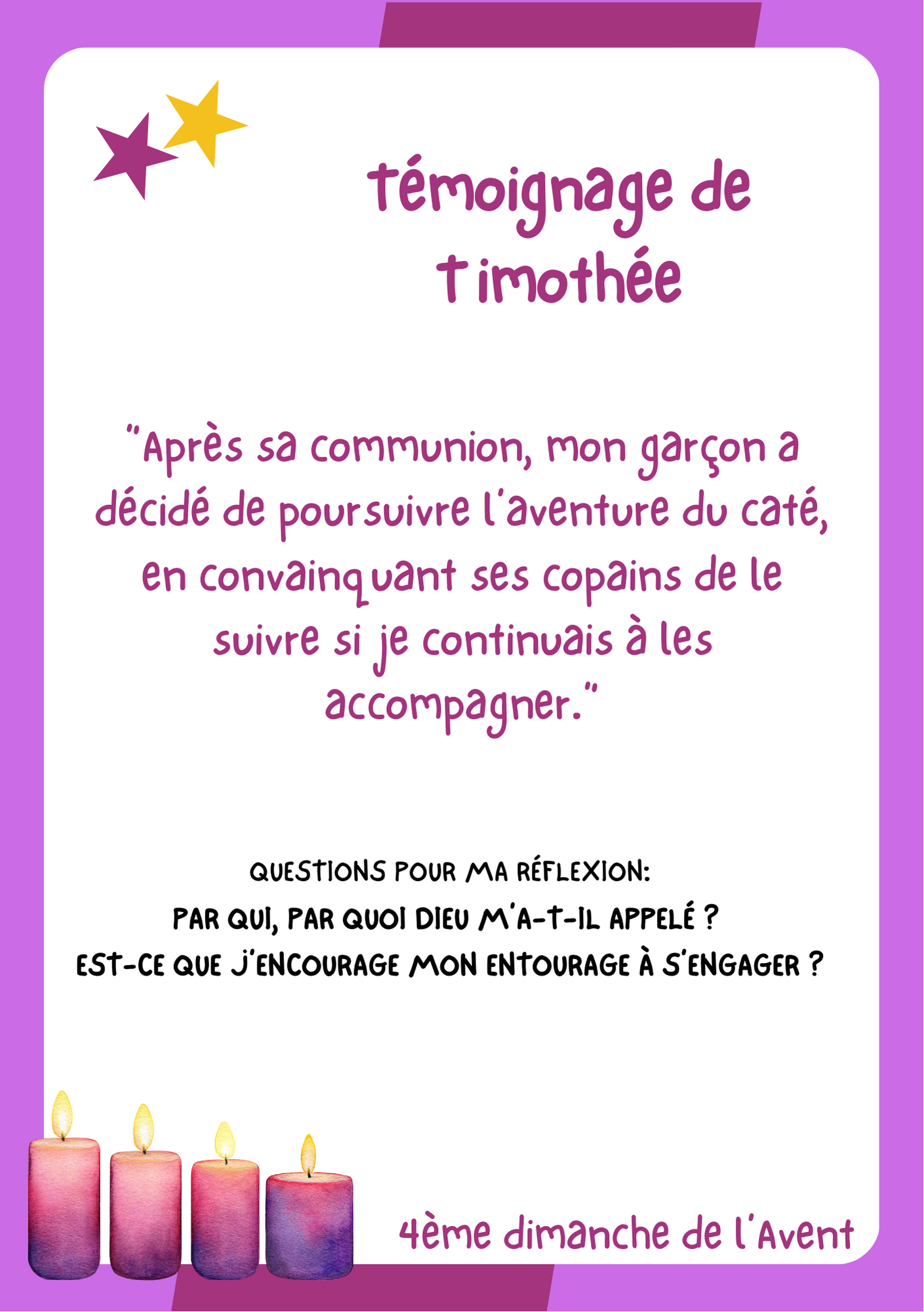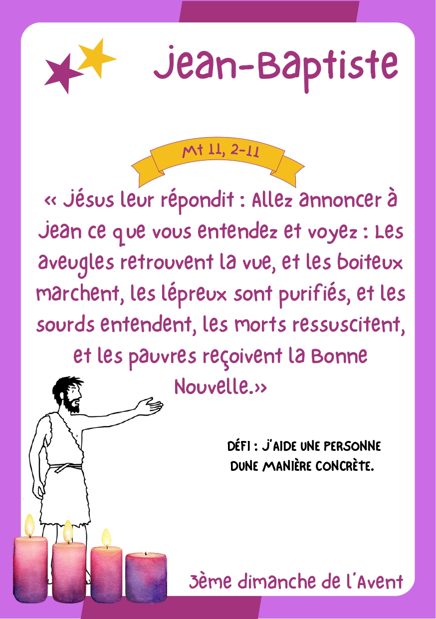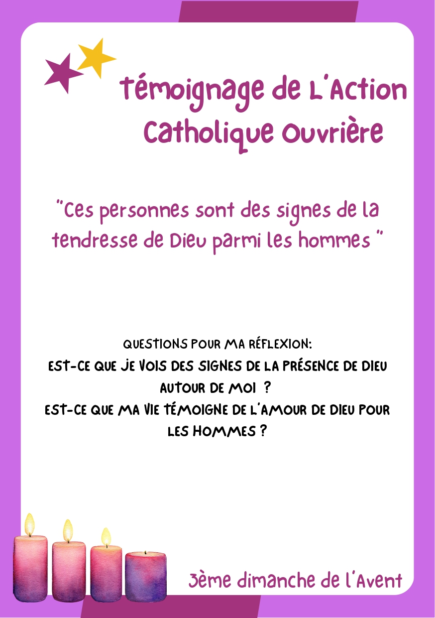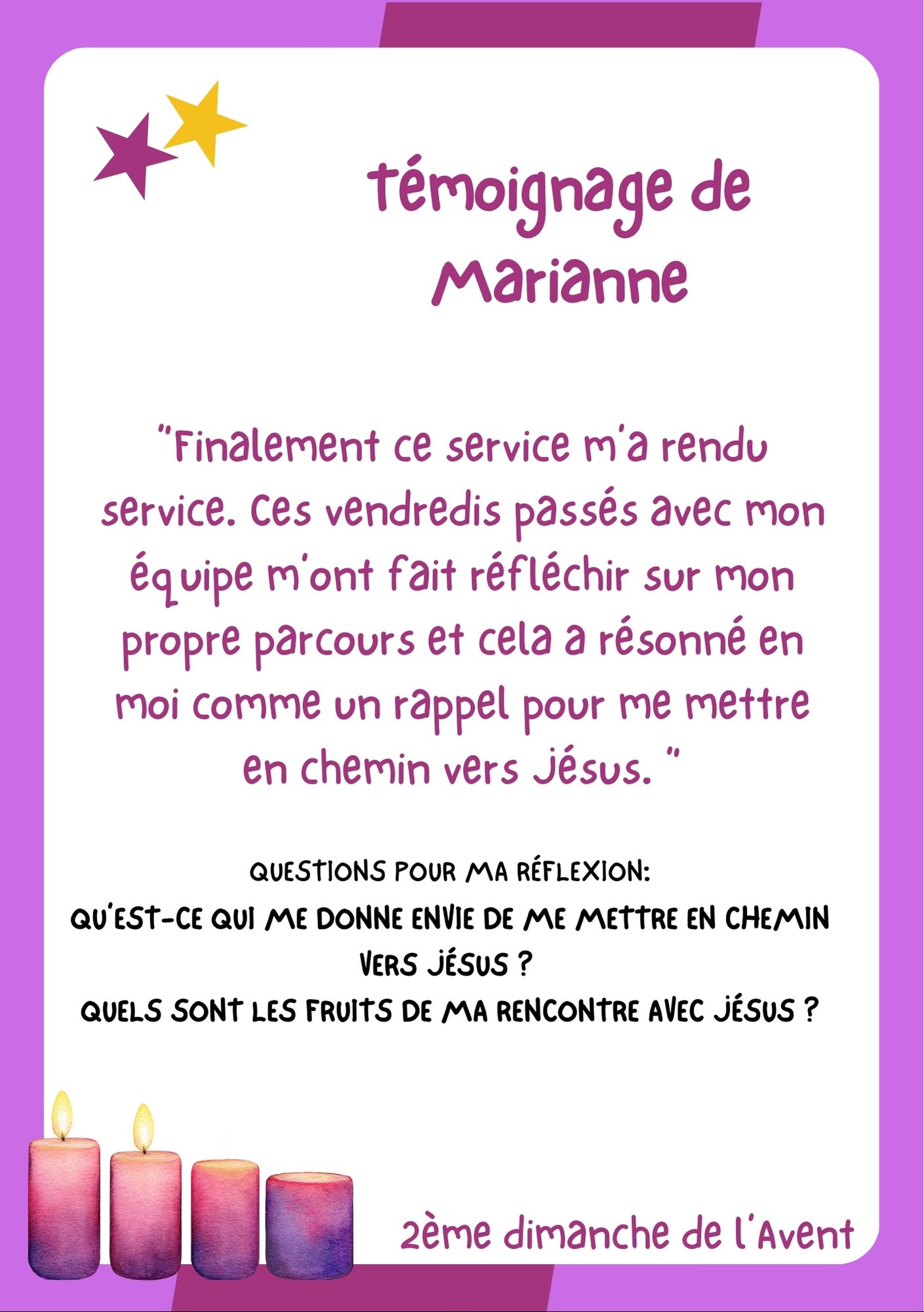 - Pendant le temps de l’avent, vous recevrez à la fin de chaque messe, un petit feuillet avec une phrase issue des textes bibliques, un extrait du témoignage entendu et deux questions pour nourrir votre réflexion durant la semaine (Cf. ci-dessous).