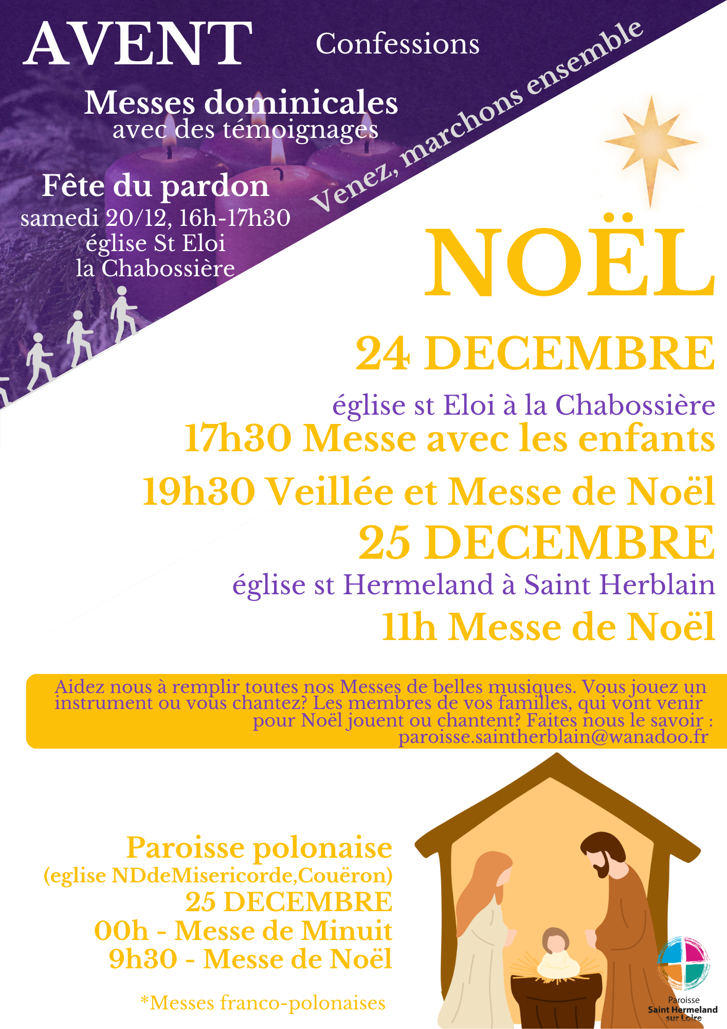 - Les horaires des messes de Noël sont disponibles dans le bulletin ou à la page Trouver un horaire de ce site. Si vous êtes musicien ou si dans votre entourage présent au moment de Noël, il y a des musiciens qui souhaitent participer à l’animation des messes de Noël, vous pouvez nous envoyer un mail : Cette adresse e-mail est protégée contre les robots spammeurs. Vous devez activer le JavaScript pour la visualiser.