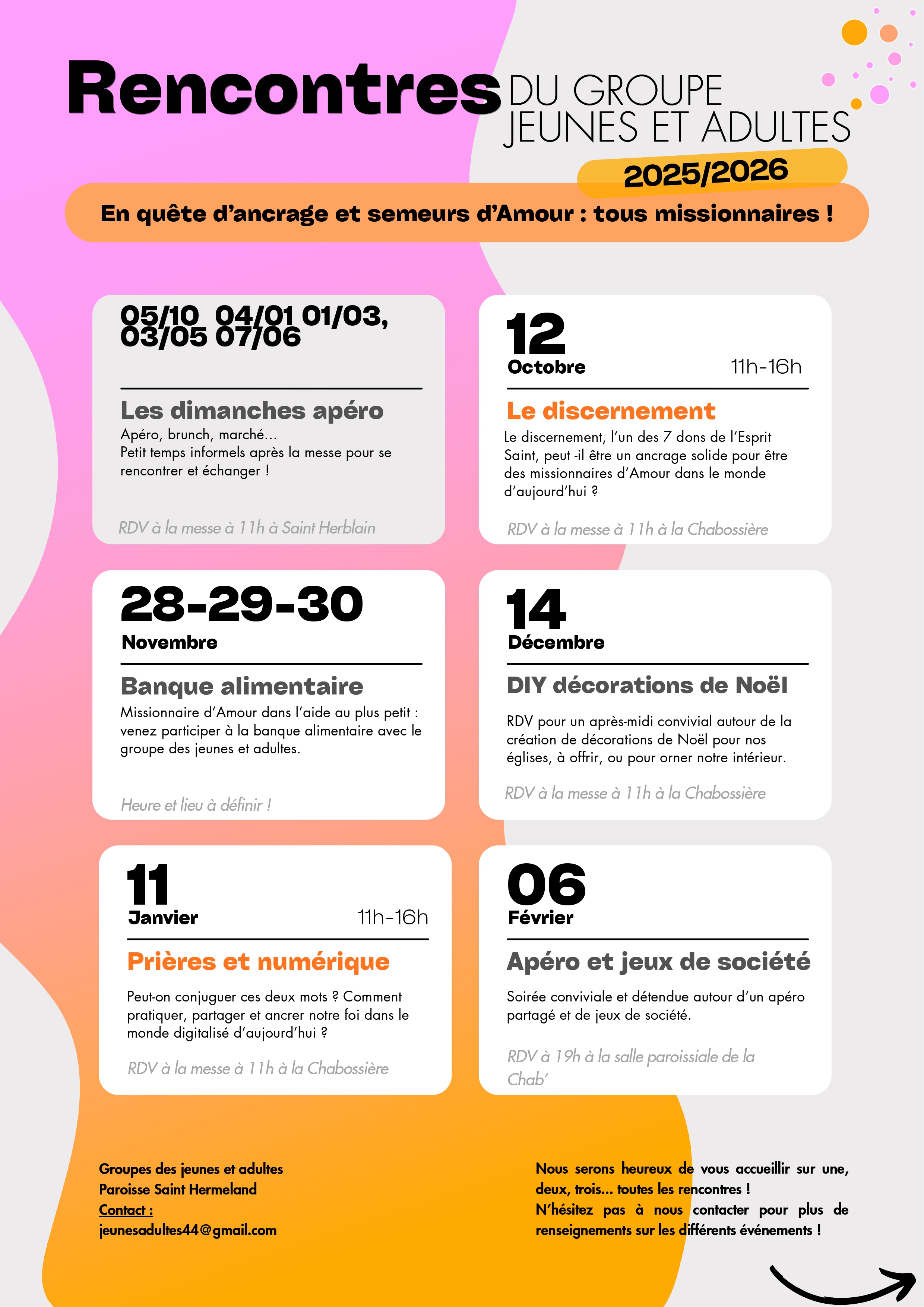 Un groupe d'adultes se rencontre plusieurs fois dans l'année pour discuter autour de thèmes préparés par binômes. Une première rencontre a eu lieu lors de la rentrée paroissiale le 14 septembre pour organiser l'année à venir. Vous êtes tous les bienvenus.